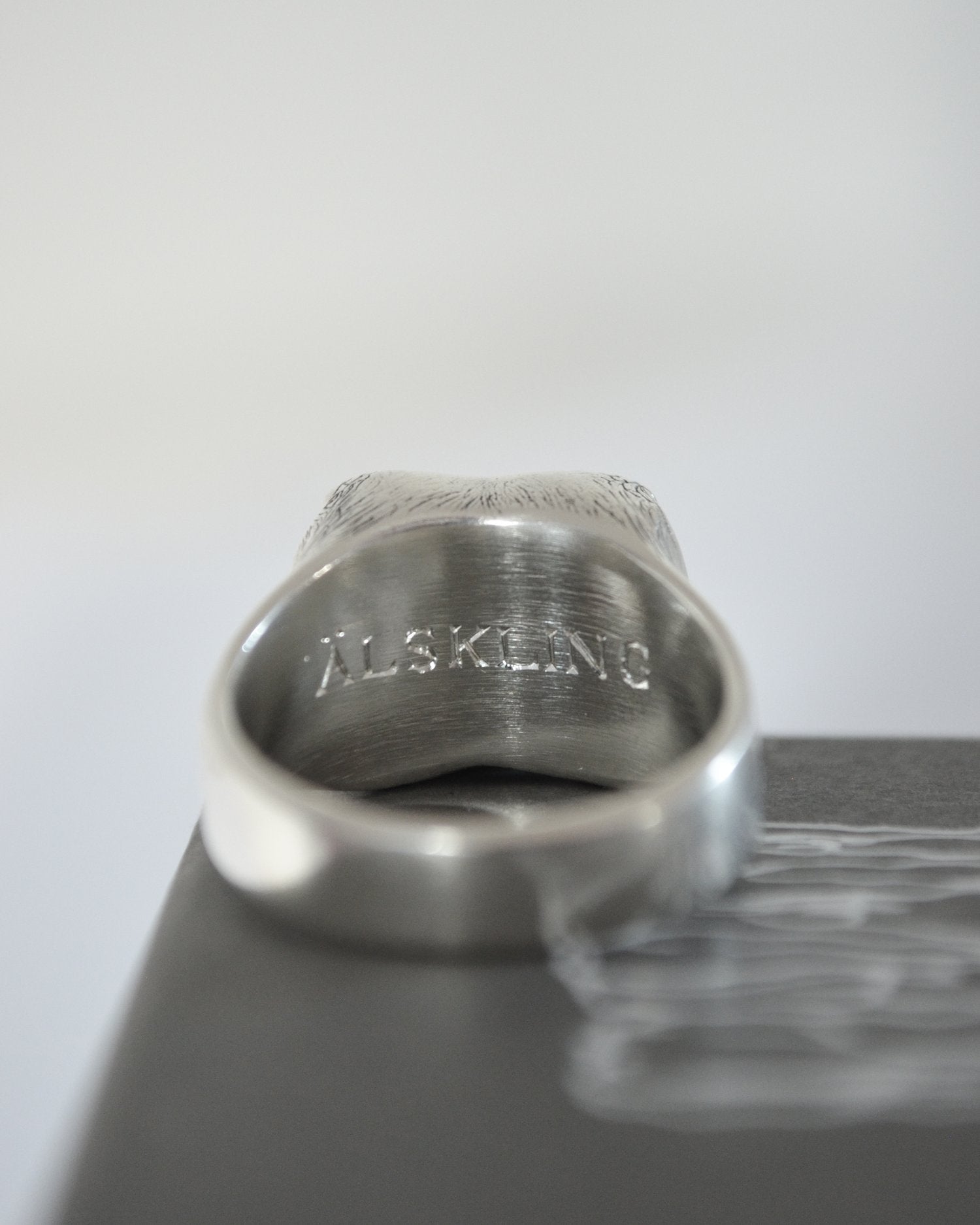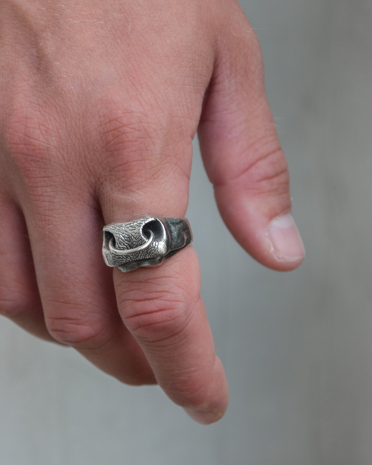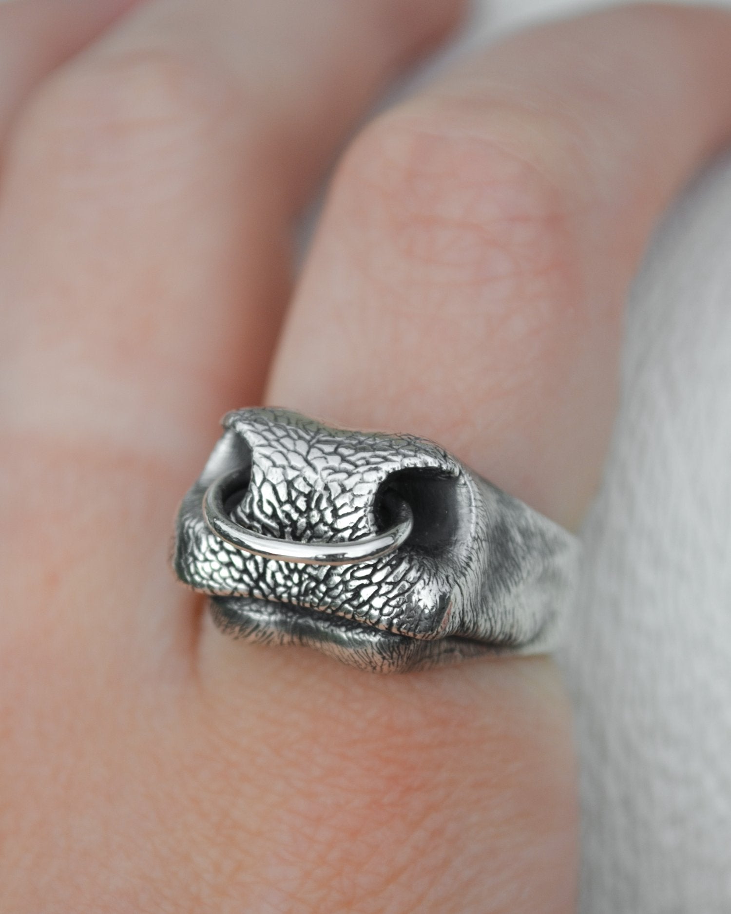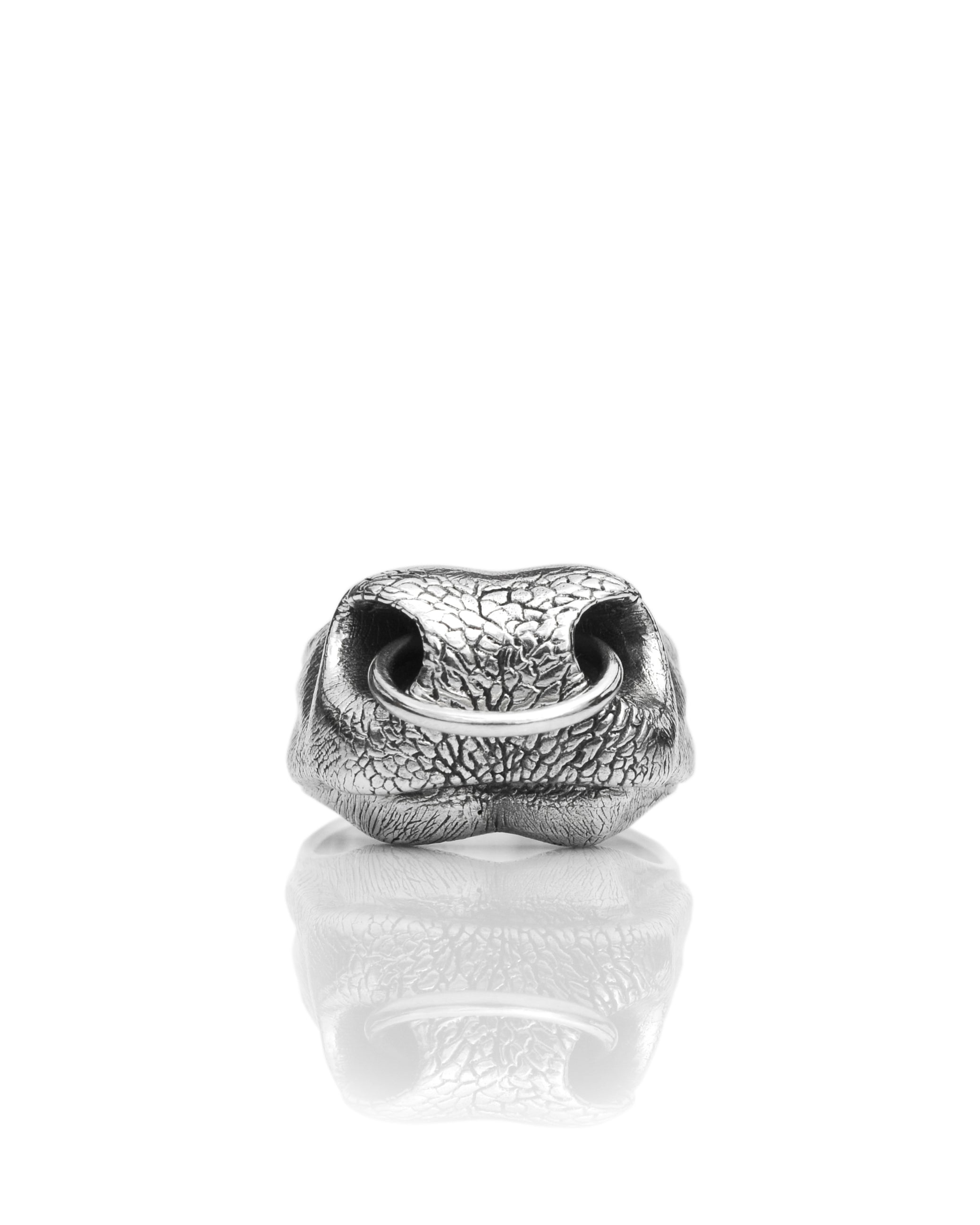 This ring has been hand carved by Kathryn from a block of wax to create the nose shape and then cast in sterling silver. It is then sent to Edinburgh’s Assay Office where it is quality checked and engraved with Kathryn’s hallmark.