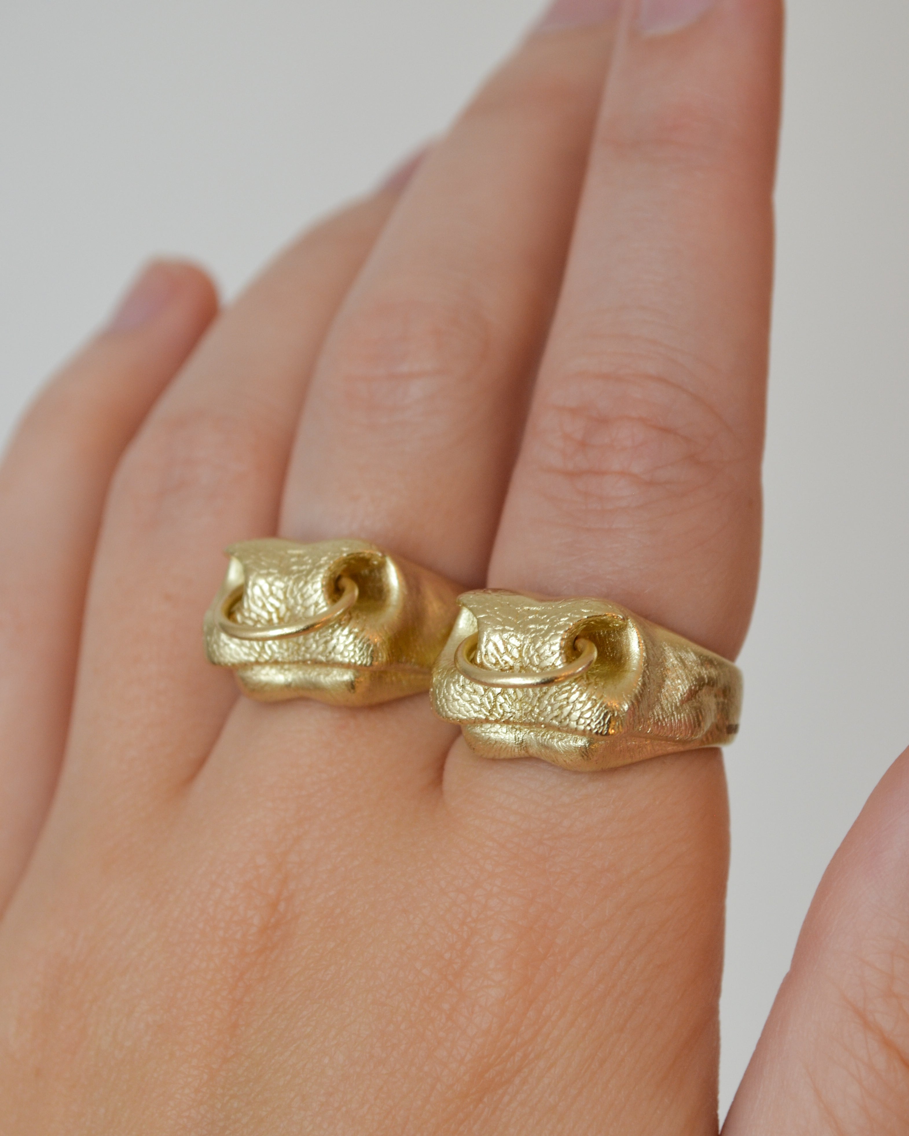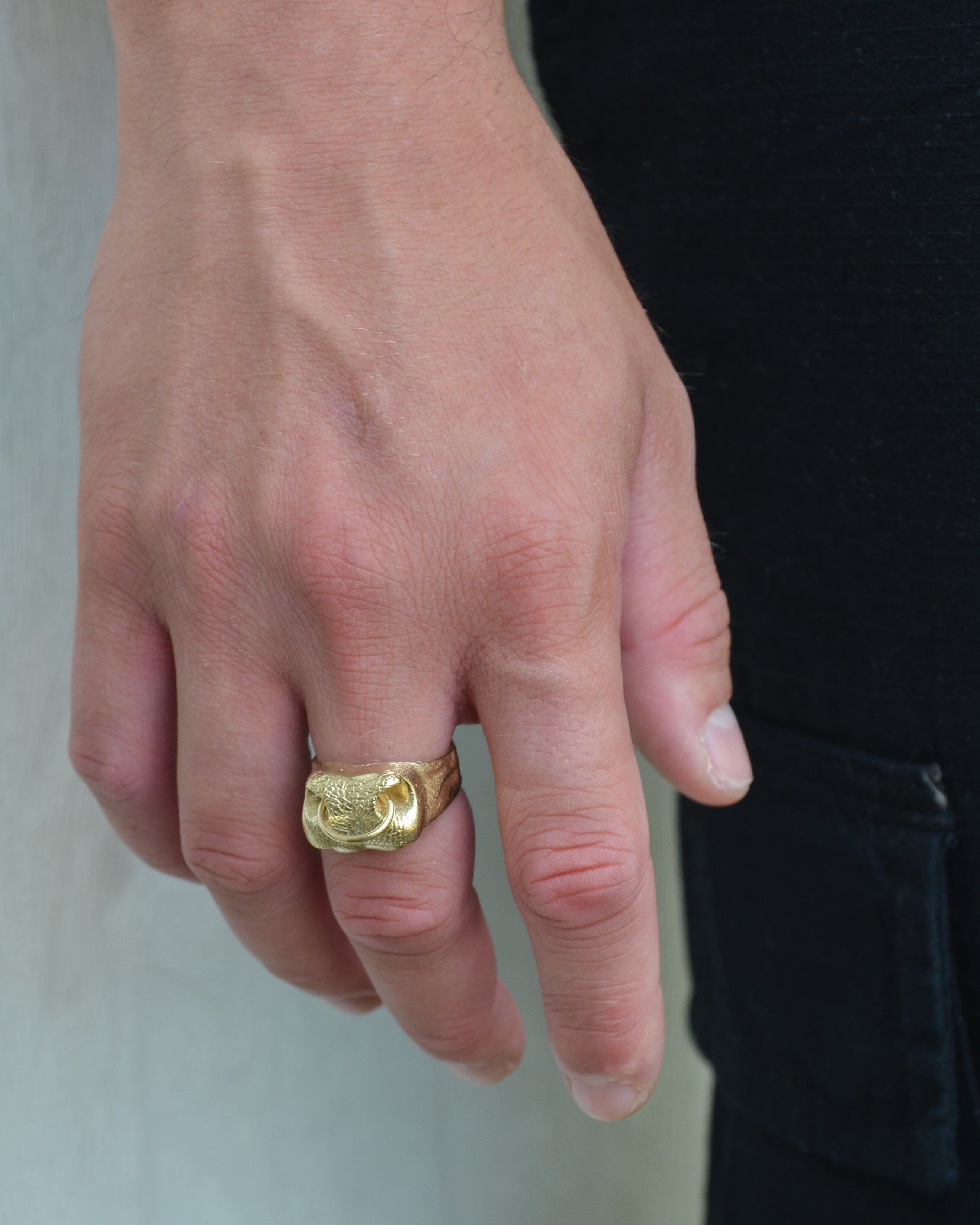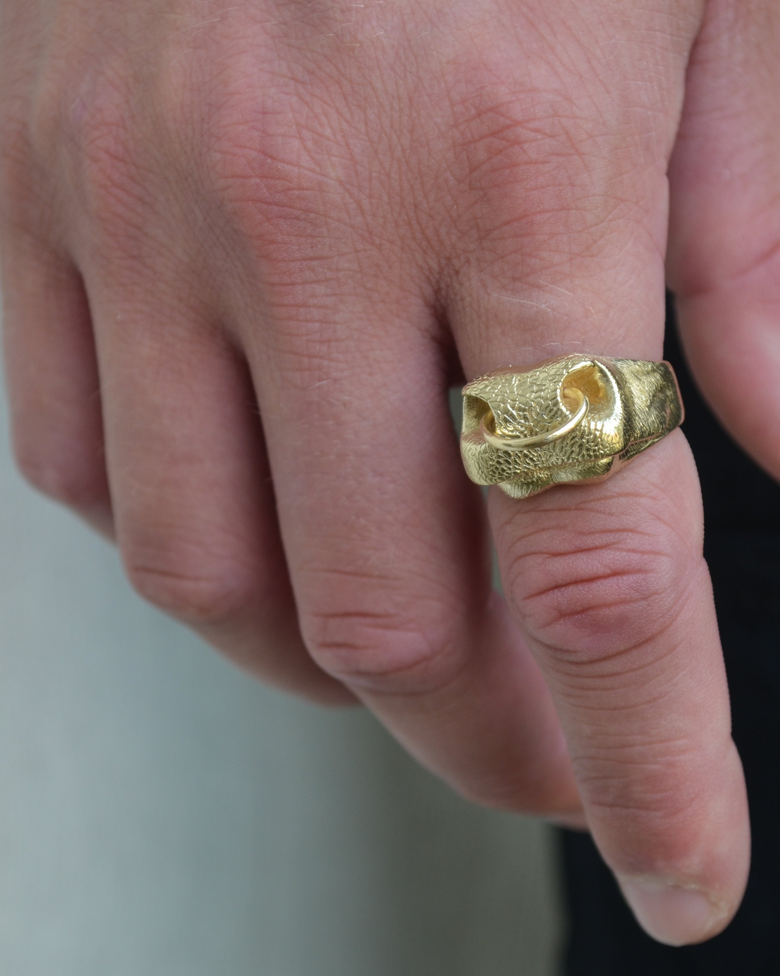 This ring has been hand carved by Kathryn from a block of wax to create the nose shape and then cast in solid 9ct yellow gold with a 9ct yellow gold nose ring attachment. It is then sent to Edinburgh’s Assay Office where it is quality checked and engraved with Kathryn’s hallmark.
