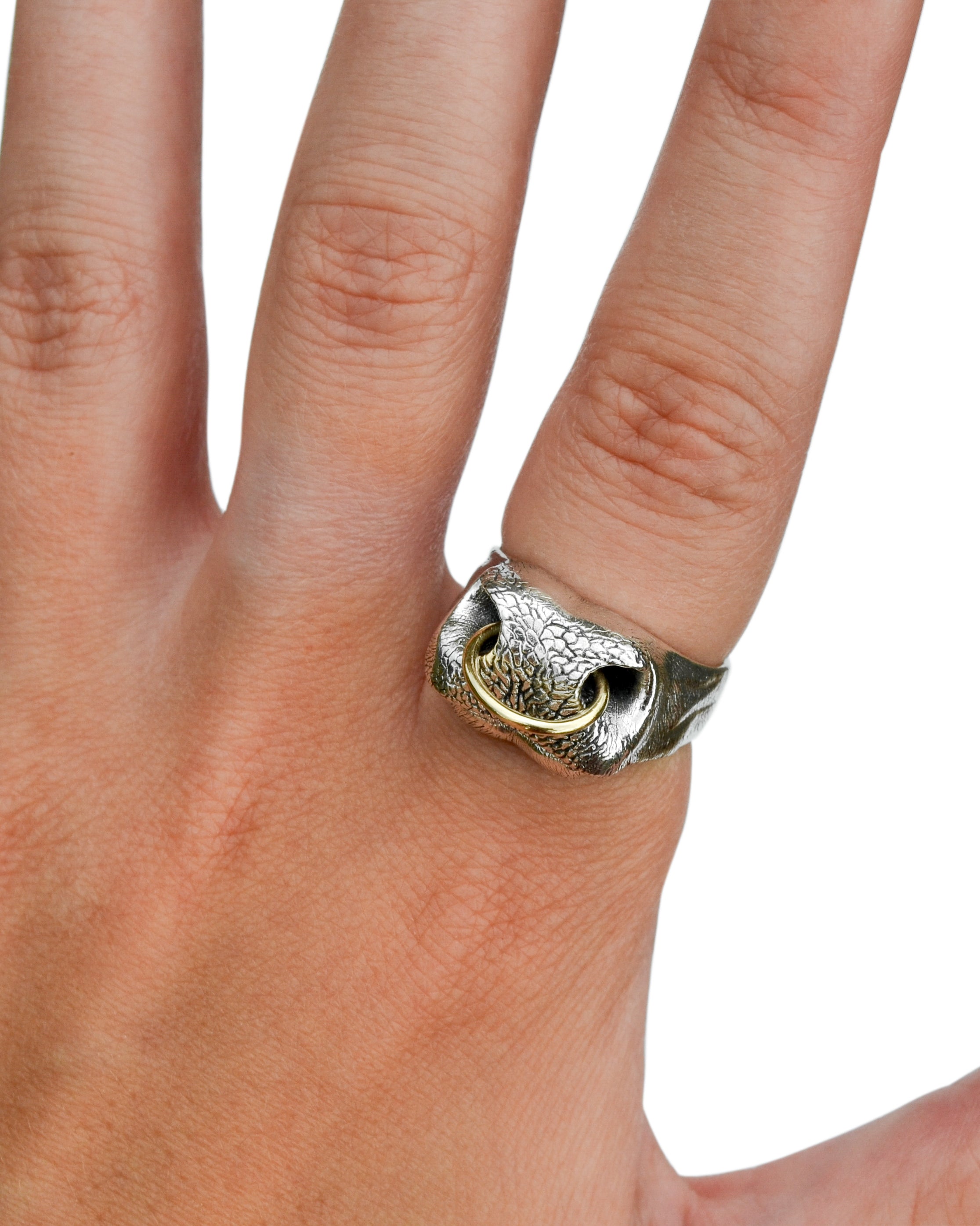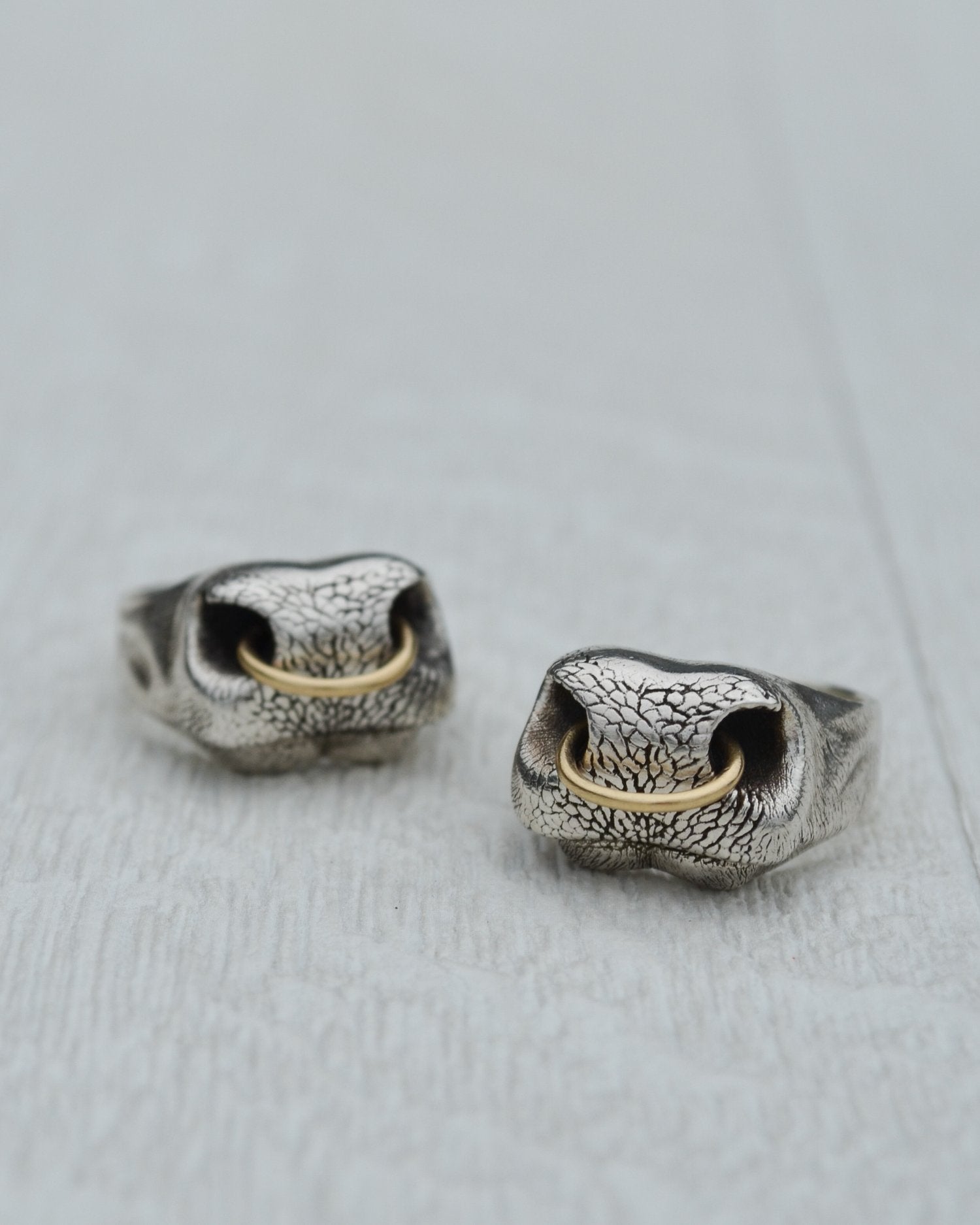 This ring has been hand carved by Kathryn from a block of wax to create the nose shape and then cast in sterling silver with a solid 9ct yellow gold nose ring attachment. It is then sent to Edinburgh’s Assay Office where it is quality checked and engraved with Kathryn’s hallmark.