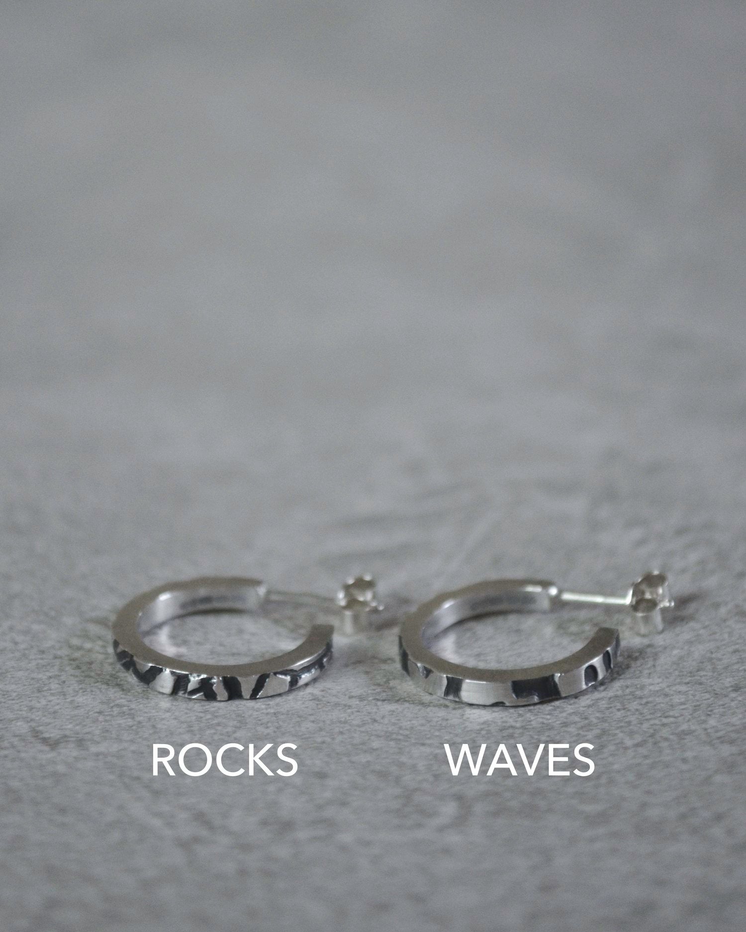 The North Coast Hoops come in two different textures. The first texture is the ‘Rocks’ texture. It is sharp and angular which represents the unique, rocky, Causeway Coastline. The second texture is the ‘Waves’ texture. It is more bubbly & rounded representing the chopping waves along the North Coast of Northern Ireland. This piece is handmade using recycled sterling silver.