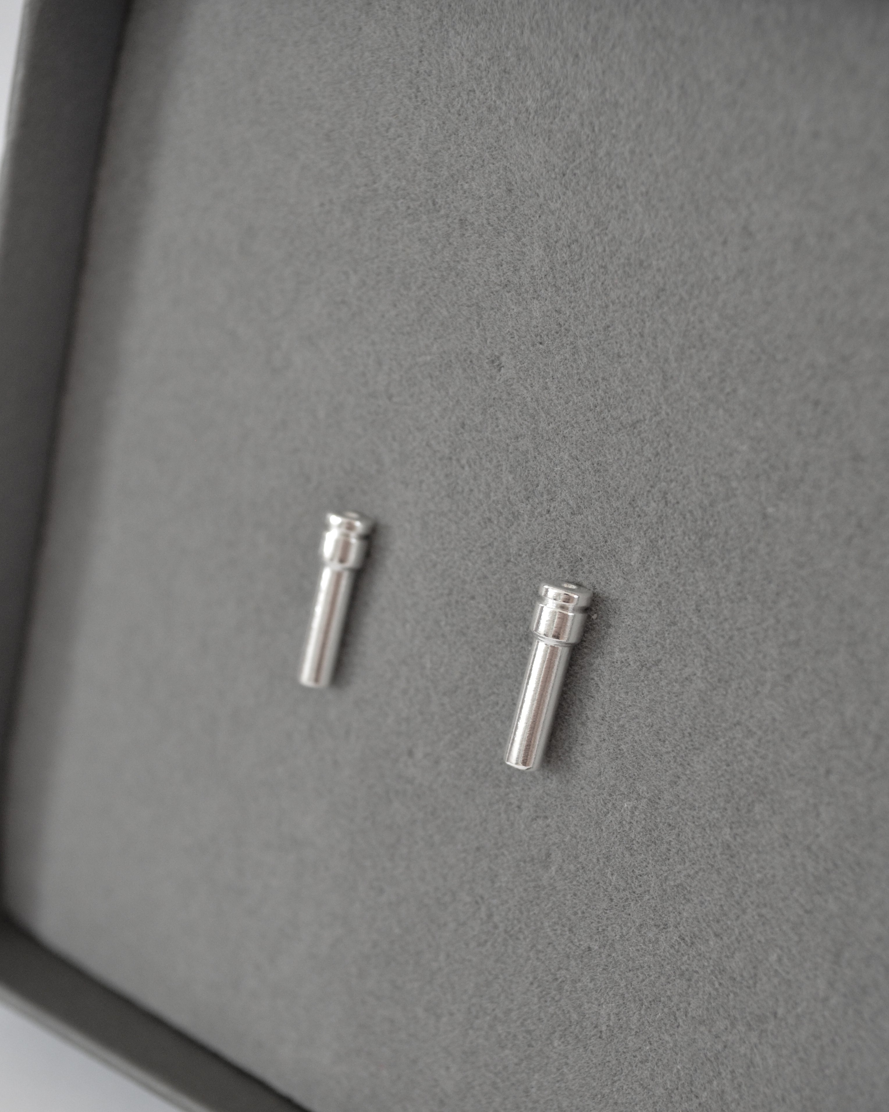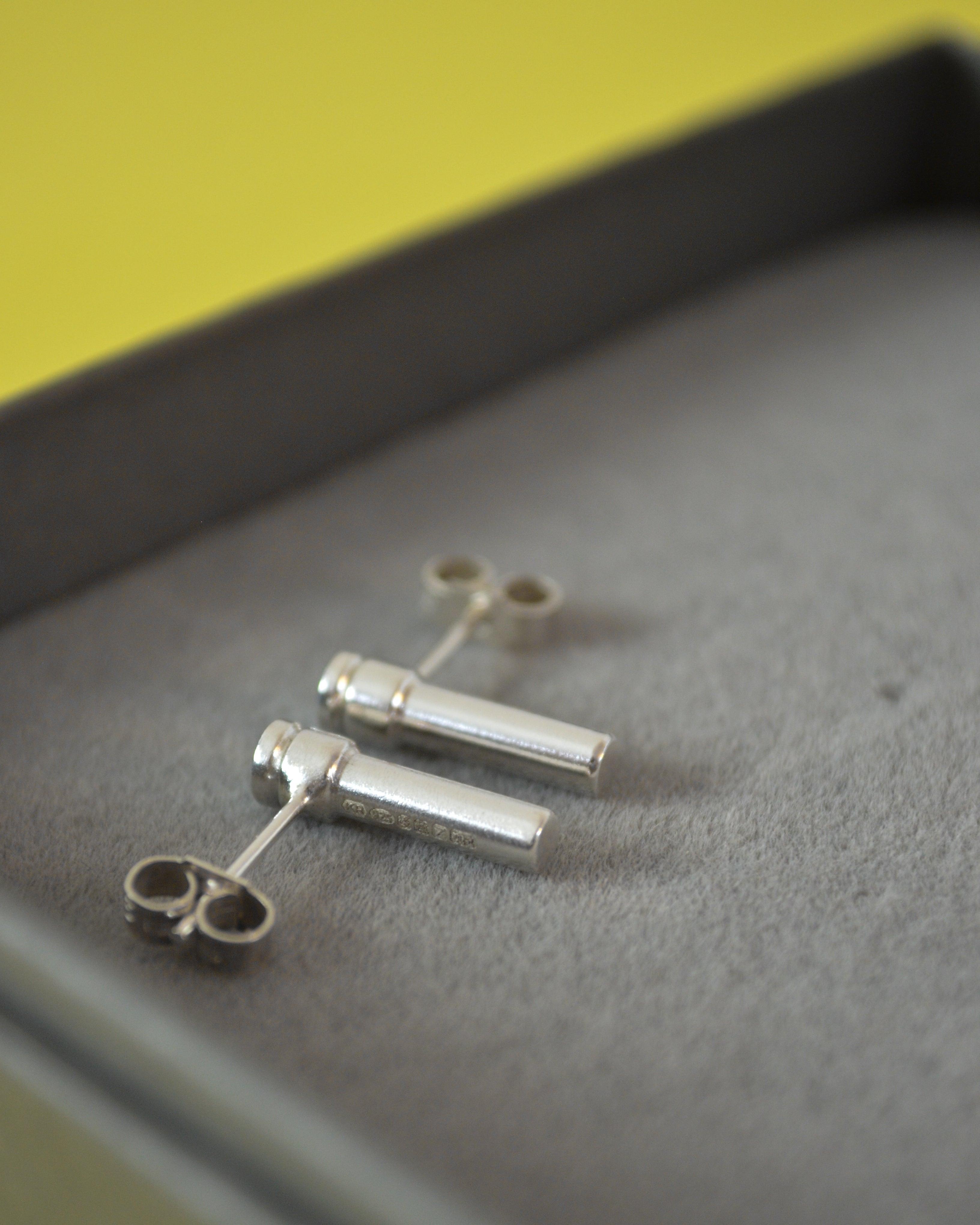 Kathryn has taken the inspiration for this piece from the dairy farm she grew up on. Her family farm changed from a predominantly beef farm to a dairy farm when she was a teenager, along with the introduction of milking equipment which Kathryn found really fascinating. These stud earrings are in the shape of the cluster cups used in dairy farming.
