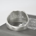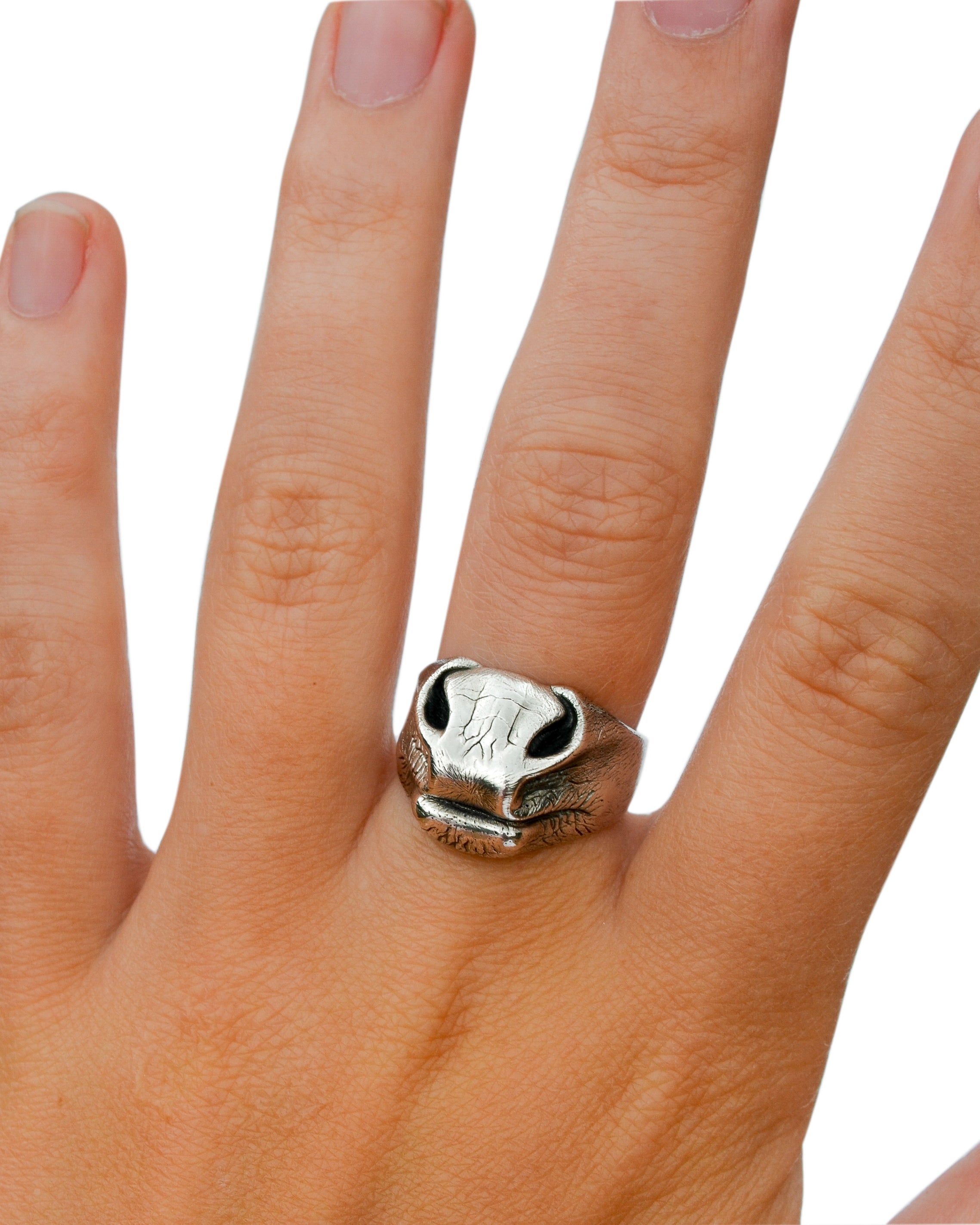 A ring in the shape of a horse's nose, handcrafted in recycled sterling silver with a satin finish, complete with Kathryn’s hallmark.